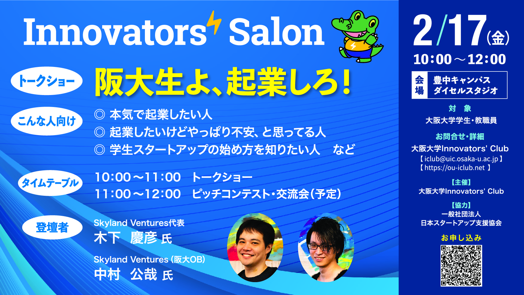 Skyland Venturesはシードスタートアップへの投資を行うVCであり、これまで120社を超えるシードスタートアップへの投資実績があります。今回はそんなSkyland Venturesの代表である木下様と、木下代表のもとで活躍している阪大OBの中村様に来ていただき、「阪大生よ、起業しろ!」という挑戦的なタイトルでみなさんにお話をしていただこうと思っています。