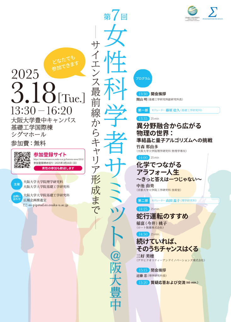 3月18日(火)13:30から16:20 大阪大学豊中キャンパス基礎工学国際棟シグマホールお申込みは、上記ポスターのQRコードあるいは以下からどうぞ。お申込みフォーム詳細は以下からもご確認ください。基礎工イベントページ -