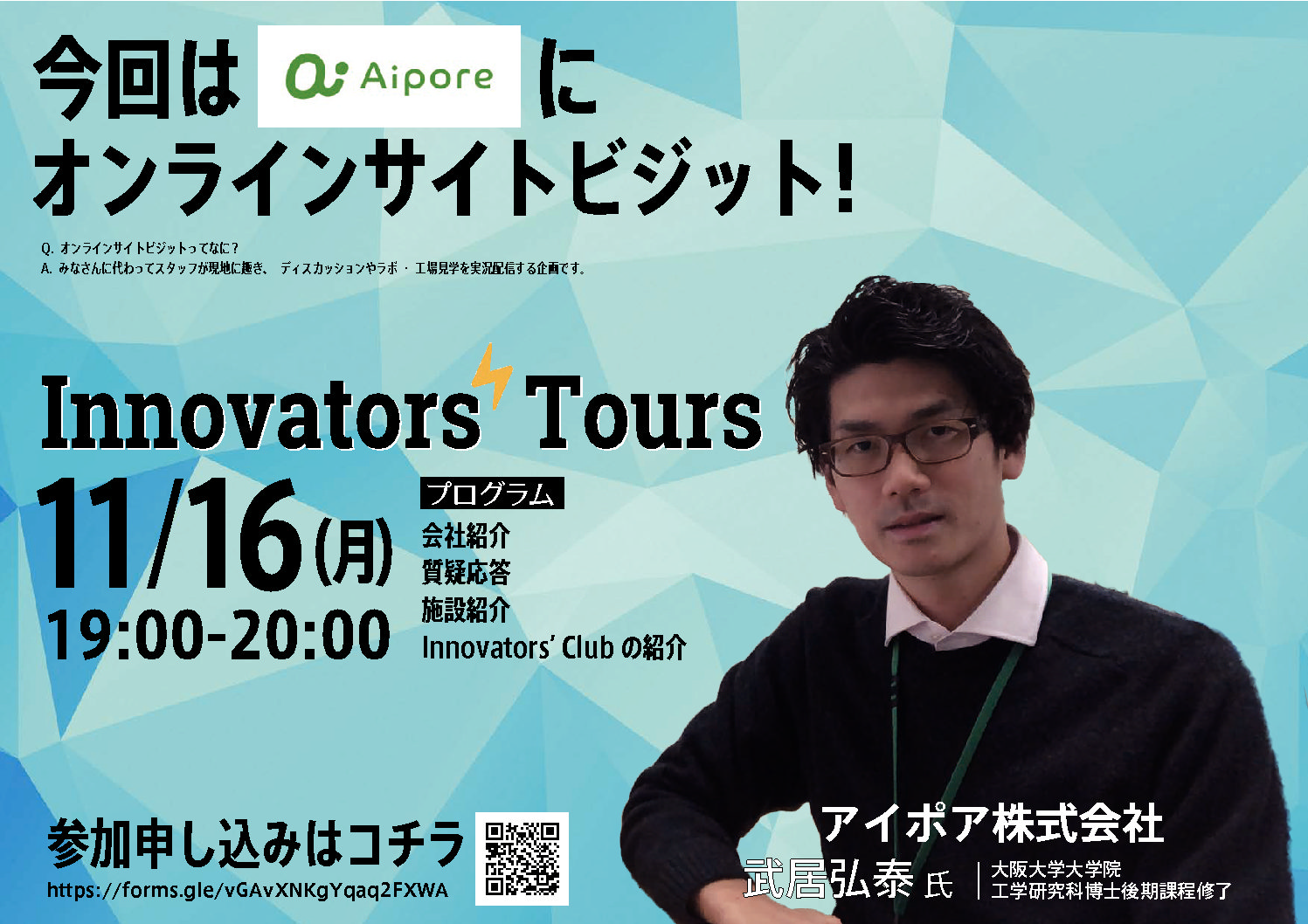 【阪大生限定】11/16(月)19:00から、阪大発ベンチャーアイポア株式会社見学会を(オンラインで)開催します! -Innovators’ Tours #2-