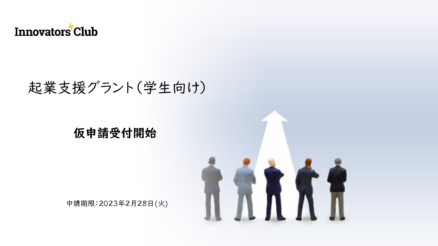 起業支援グラント(学生向け)募集概要起業支援グラント(学生向け)とは、Innovator's Clubメンバーであって、自身のアイデアの社会実装を目指し取り組んで... -