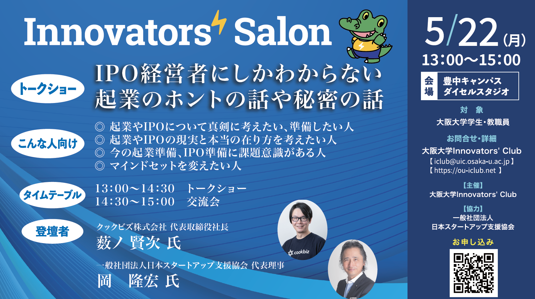 2月17日(金)i-Salon 10:00から豊中キャンパスダイセルスタジオにて トークショー・交流会等「阪大生よ、起業しろ!」※阪大生・教職員限定イベントです。