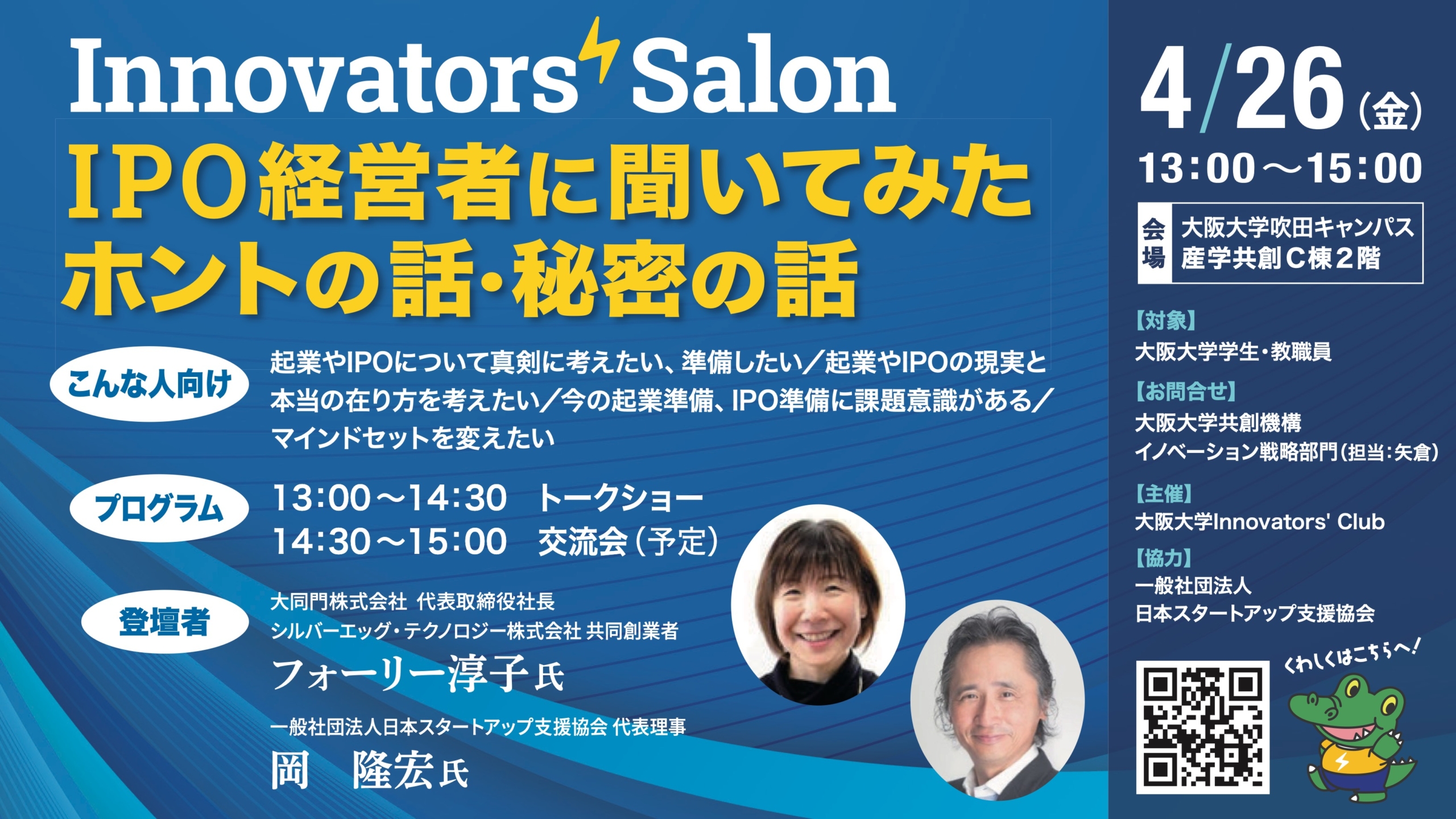一般社団法人スタートアップ支援協会代表理事であり、大阪大学Innovators’Clubのビジネスアドバイザーでもある岡氏がコーディネーターとなり、IPOをした企業の代表を講師としてお招きし、なかなか聞けない起業のホントの話や秘密の話を聞いてしまおうという企画です。