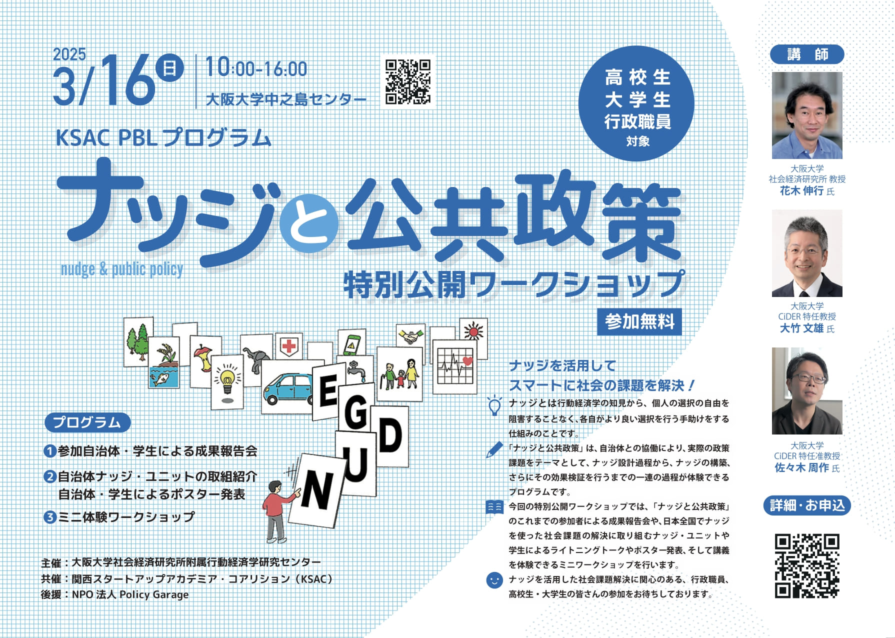 大阪大学で毎年開講されている人気講義「ナッジと公共政策」を特別公開!ナッジとは、行動経済学の知見に基づいて人の行動変容を後押しするアプローチです。講義で学生が立案したアイデアとその社会実装の成果や、行動経済学を活用した政策課題の解決に取り組む全国の自治体が実践を報告します。講義のお試し版として、ミニワークショップもあります。