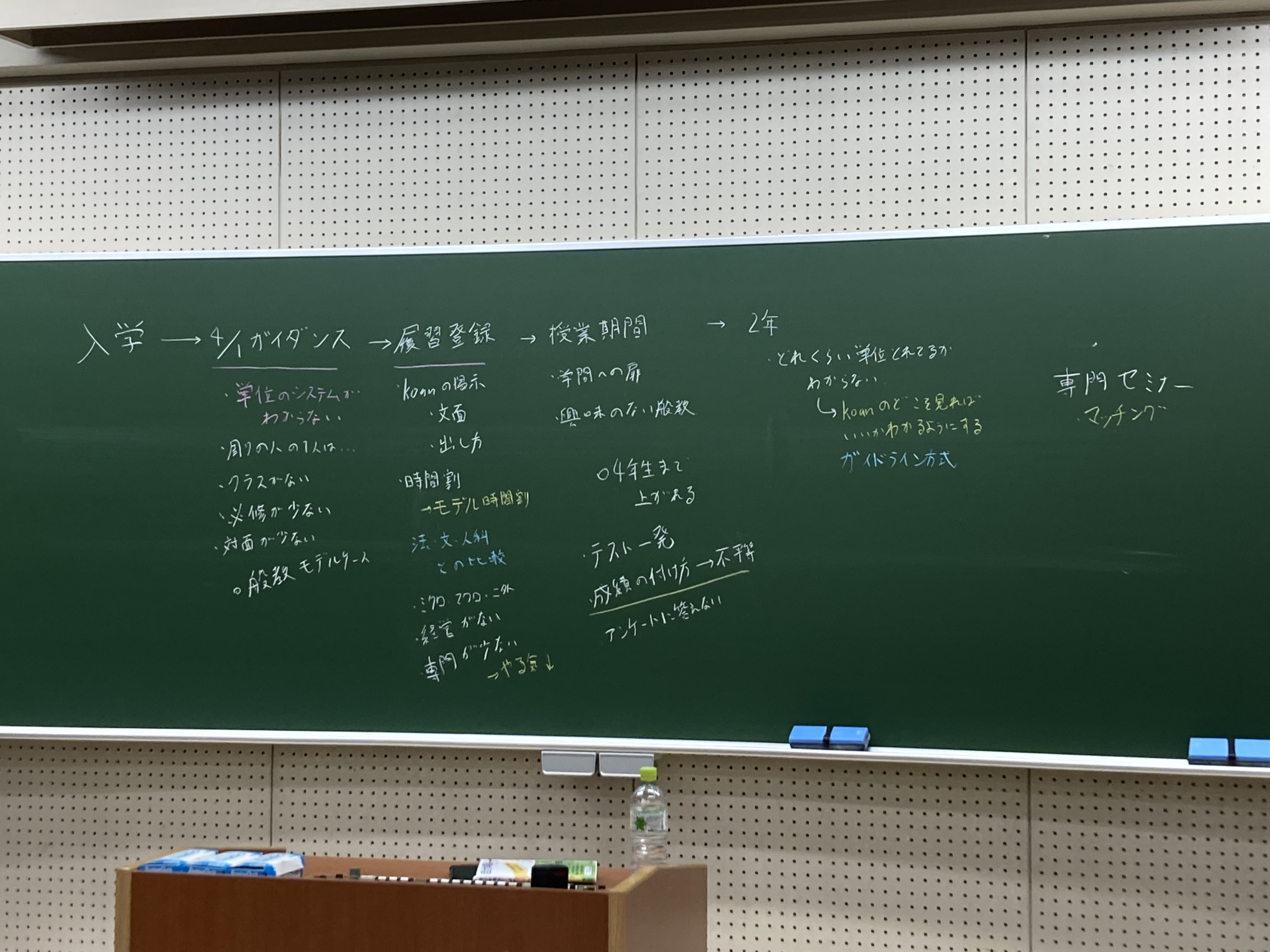 新入生は入学してすぐガイダンスを受けますが、どの単位がいくら必要か複雑でわかりにくく、情報が大量に載っている配布資料を読んでもあまり理解できないという点に第一の問題があると考えました。また、「5人に1人は留年する」という旨を入学ガイダンスでは伝えられるのですが、それも悪い社会規範(周りがそれだけ留年しているのならば大丈夫か…という風に受け取ってしまう)になってしまっているのではないかという意見が出ました。