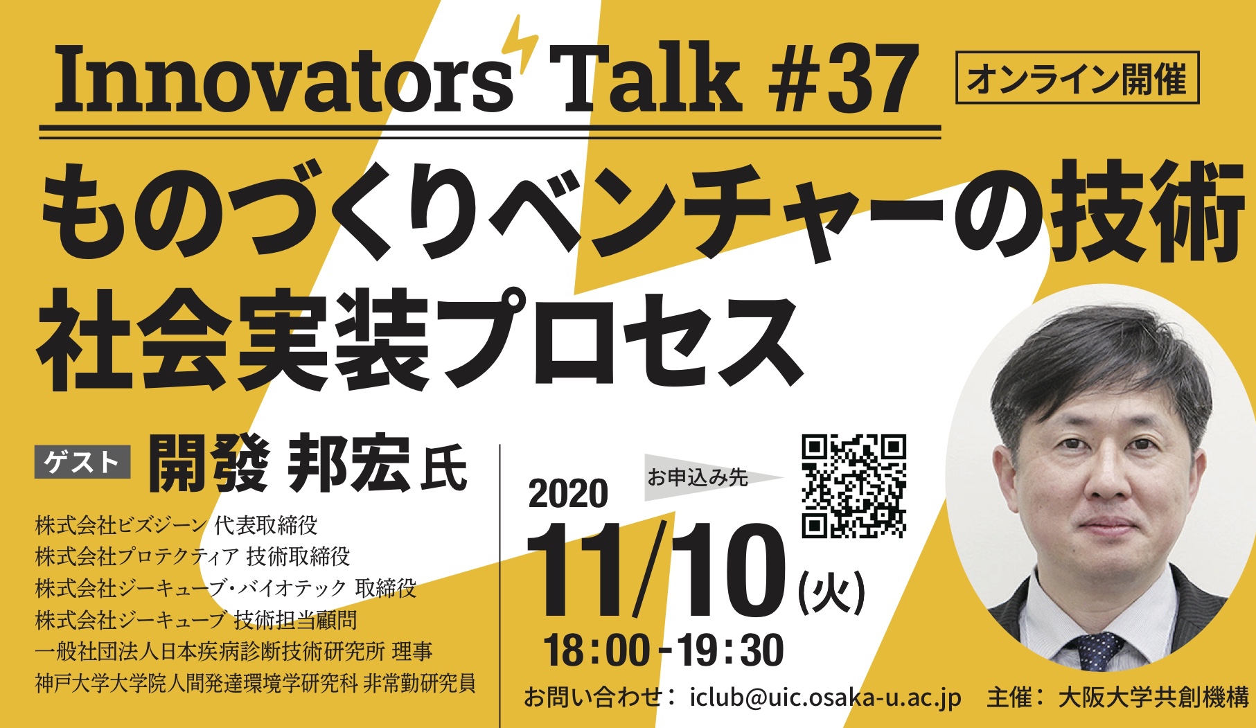 Innovators' Talk #37ものづくりベンチャーの技術社会実装プロセス2020年11月10日(火)18時~19時30分ゲスト開發邦宏氏株式会社ビズジーン 代表取締役株式... -