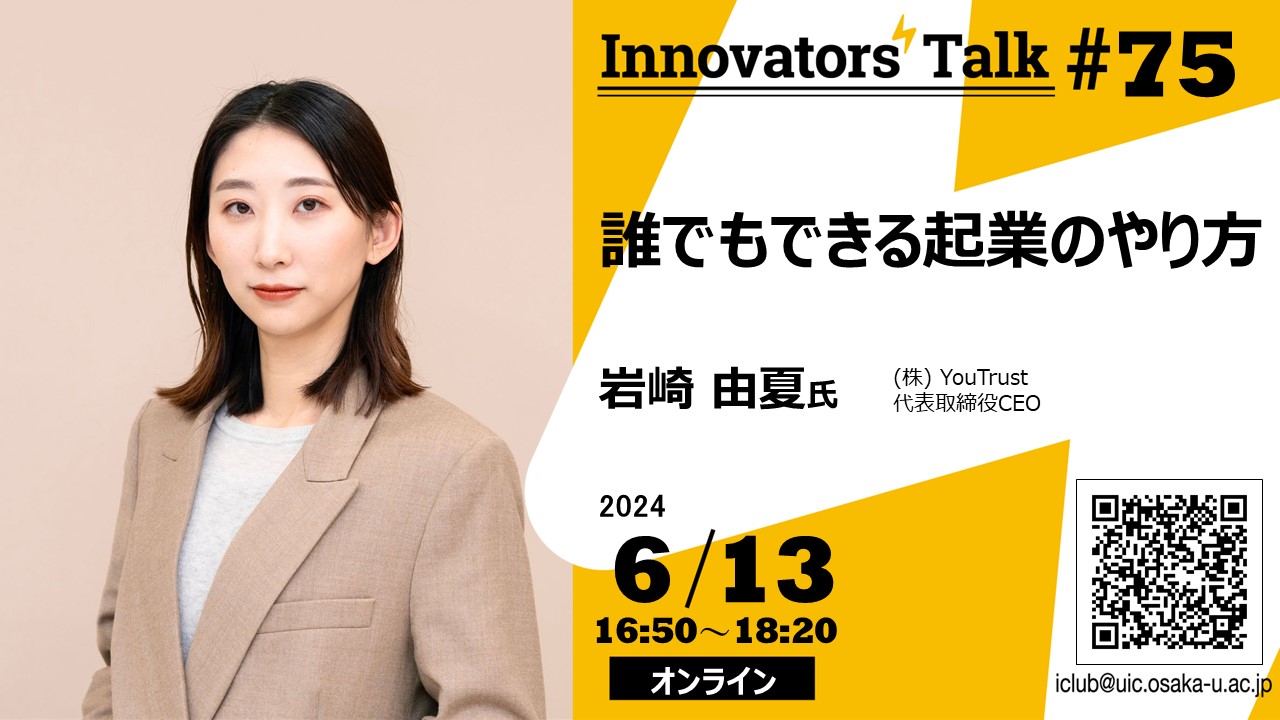 日時2024年6月13日(木)16時50分~18時20分場所オンライン(Zoom) ゲスト岩崎 由夏氏(株)YouTrust 代表取締役CEO対象大阪大学の学生、i-Clubの会員の... -