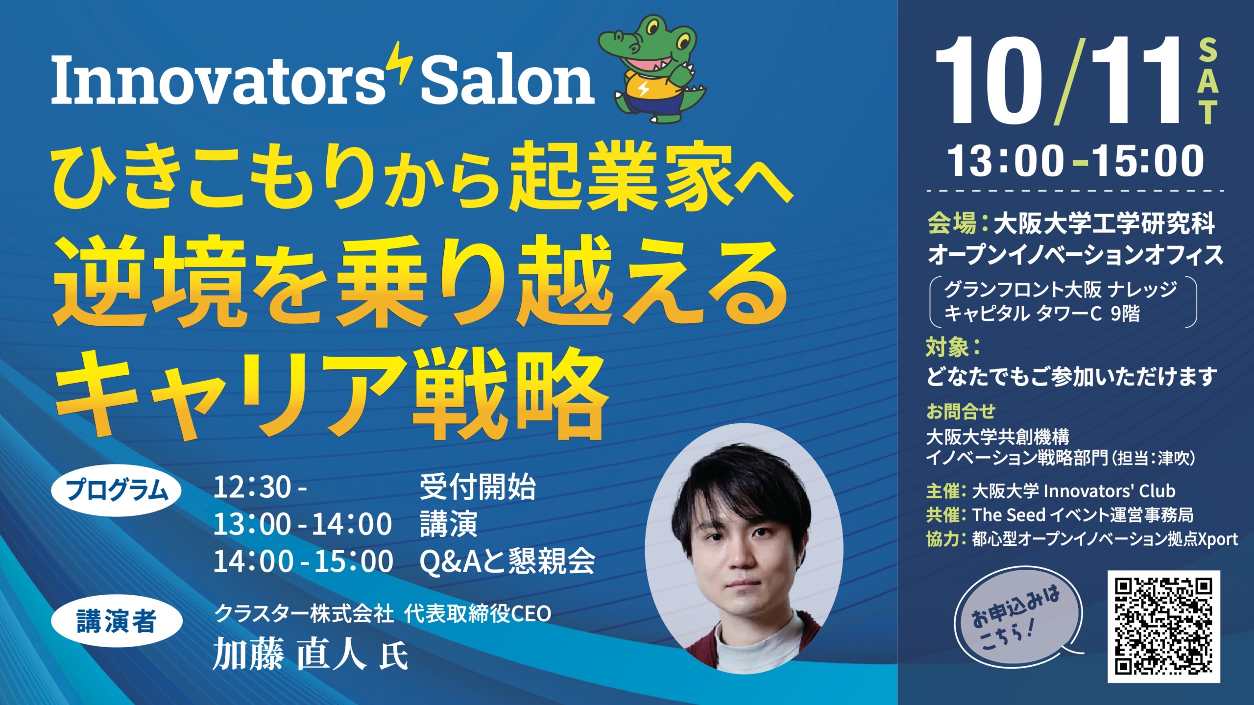 今回は、クラスター株式会社 代表取締役CEOの加藤直人氏をゲストにお迎えし、iSalonを開催します。京都大学大学院を中退後、3年間のひきこもり生活を経て起業... -